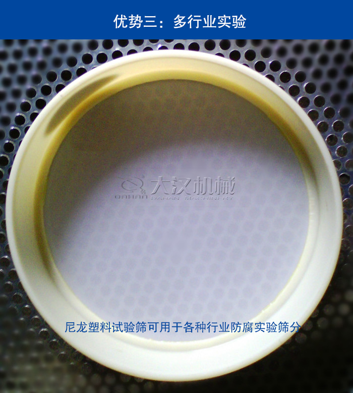 大漢機(jī)械生產(chǎn)的尼龍塑料試驗(yàn)篩廣泛應(yīng)用于食品、醫(yī)藥、化工、磨料、礦山、冶金、地質(zhì)、陶瓷、國防等行業(yè)的科研單位,實(shí)驗(yàn)室,檢驗(yàn)室,生產(chǎn)控制等的檢驗(yàn)、分析。 在為您精準(zhǔn)檢測(cè)的同時(shí)做到防腐蝕功能。