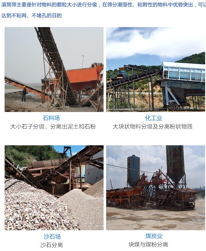 滾筒篩由一個穿孔的圓柱形滾筒組成,該滾筒通常在進料端以一定角度升高,當進料沿旋轉滾筒螺旋向下時實現物理尺寸分離,其中小于篩孔的尺寸過小的材料通過篩網,而尺寸過大的材料從滾筒的另一端排出,用于粘性和纖維材料的分類,例如在煤炭或天然石材工業中。