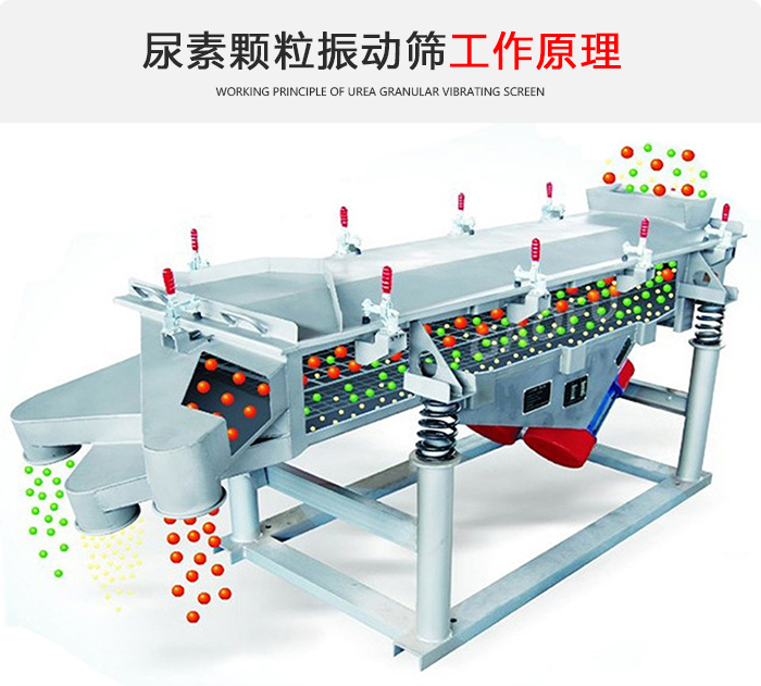 尿素顆粒振動篩主要由篩箱、篩框、篩網、振動電機、電機臺座、減振彈簧、支架等組成。